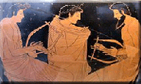 derives from Greek μουσική (mousike; "art of the Muses" as depicted on vases and